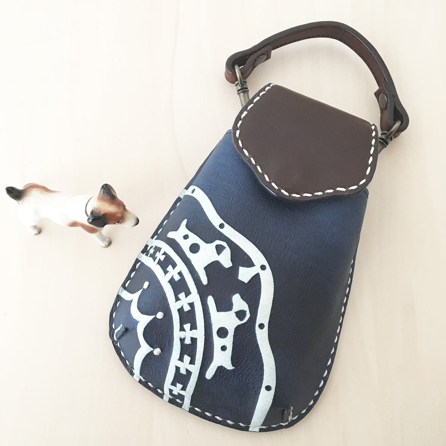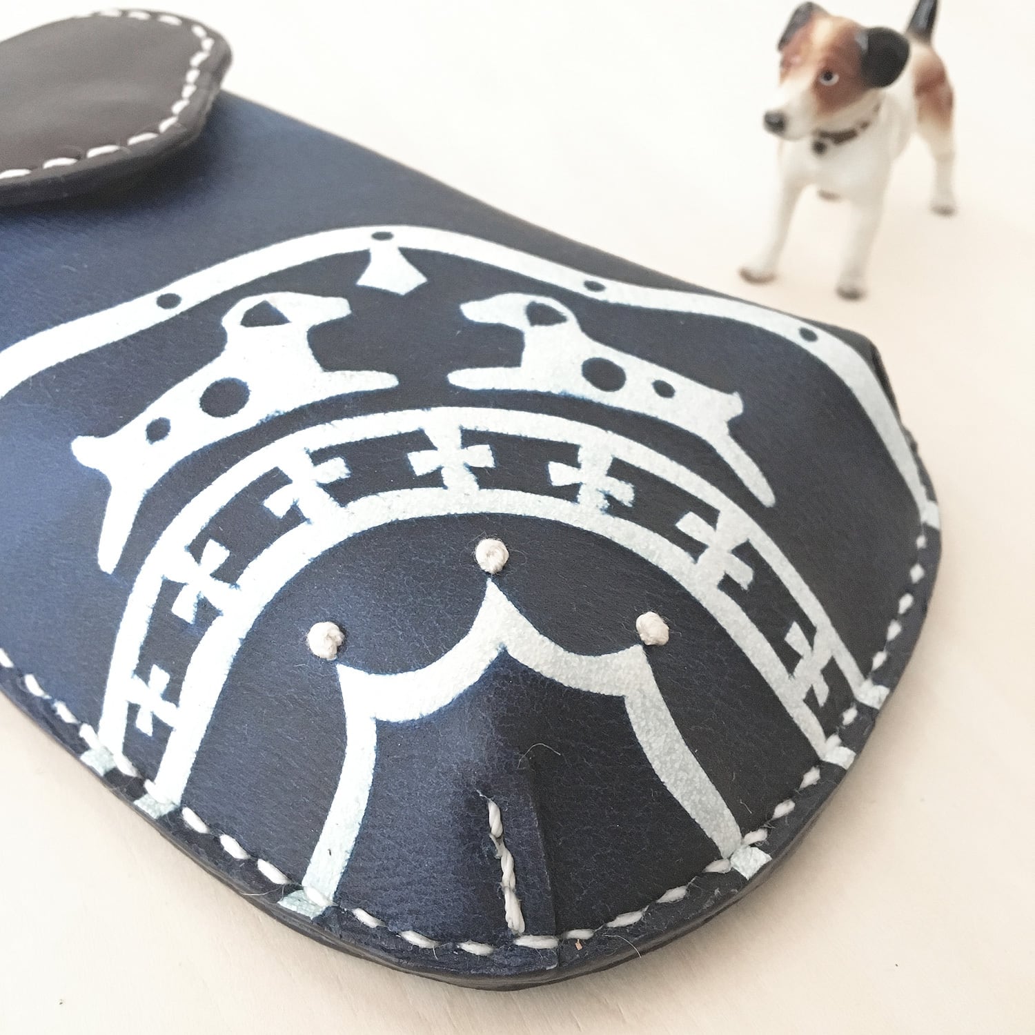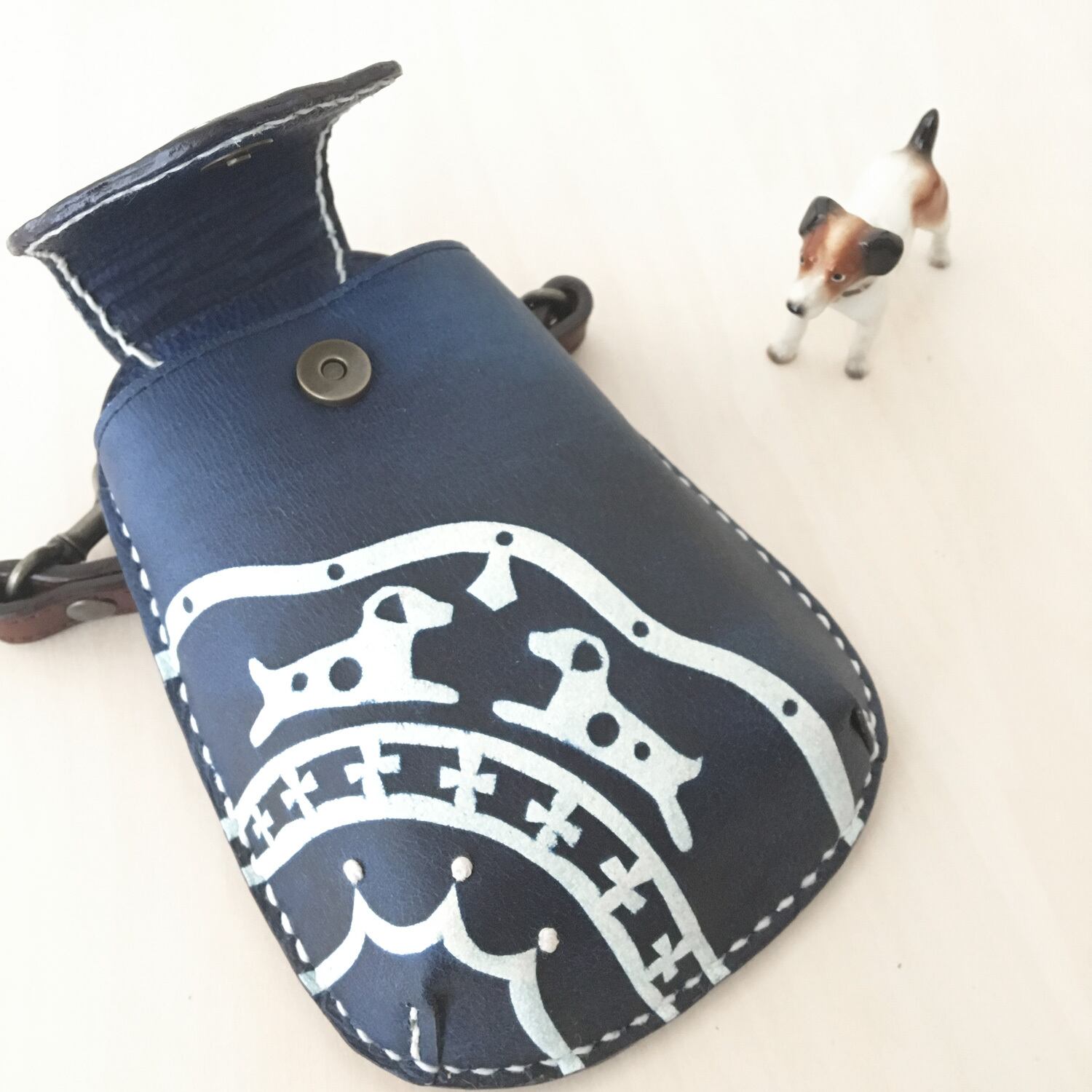 ★ひとつひとつ手作業で、柔らかい牛革を藍で型染めし、一部アクセントにフレンチノット刺繍を施したモバイルケースです。(ジャックラッセルテリアモチーフ)